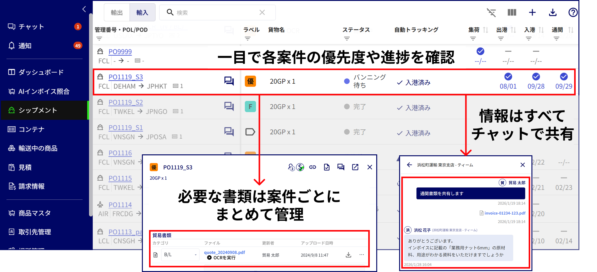 製造業・商社等の荷主企業における貿易実務の「可視化」と「効率化」を実現するクラウドサービスです。本船動静の自動トラッキング、貿易書類のAI-OCRによるデータ化・照合、関係者とのチャットコミュニケーション等をプラットフォーム上で一元化し、アナログで煩雑な業務プロセスを刷新します。